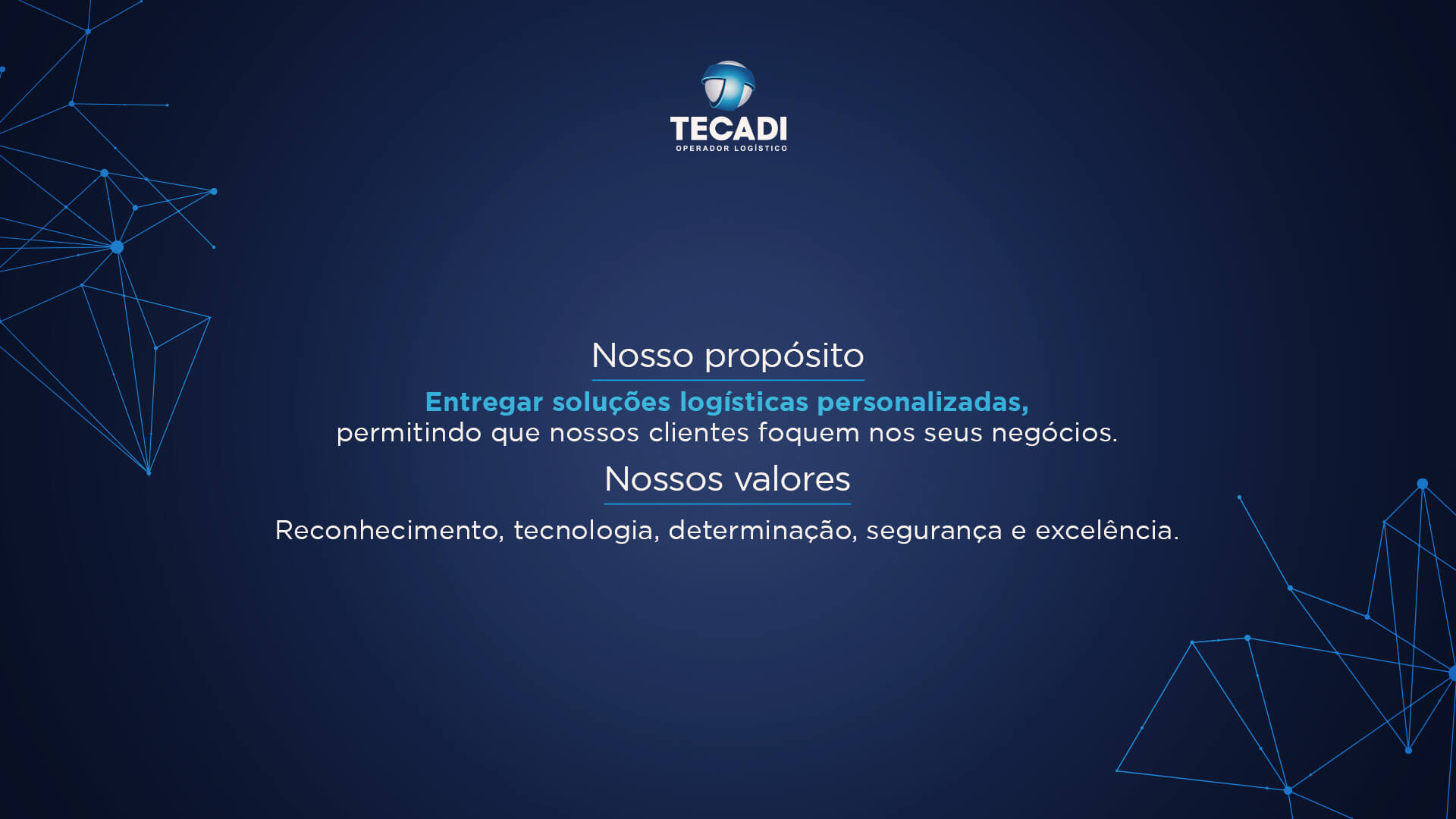 Ao longo dos anos, buscamos nos consolidarmos como referência no setor logístico, sempre guiados pela inovação, tecnologia e dedicação. Agora, estamos prontos para escrever um novo capítulo em nossa história. Com muito orgulho, apresentamos nosso novo propósito: “Entregar soluções logísticas personalizadas, permitindo que nossos clientes foquem em seus negócios.”